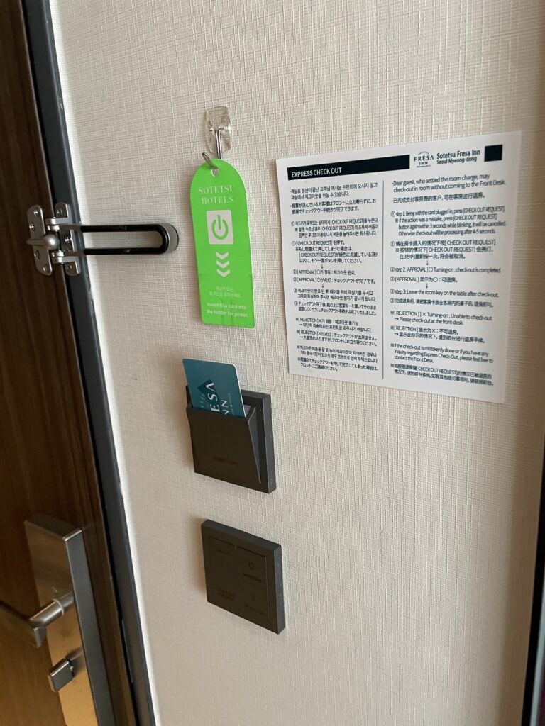 チェックアウトが室内のボタンで可能なのと、電気をつけるためのカードキーの代わりにさせる紙があった点は良かったです。