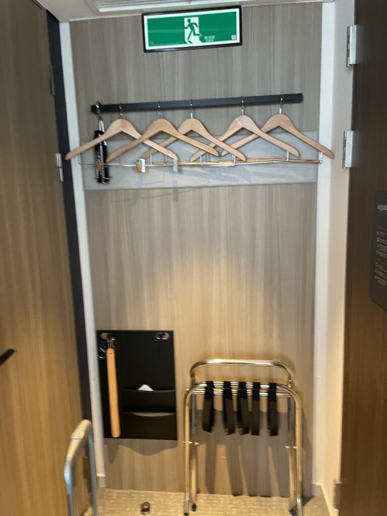 玄関には服をかける場所やスーツケース置きのかご、靴べら、消臭スプレー、使い捨てスリッパがあります。