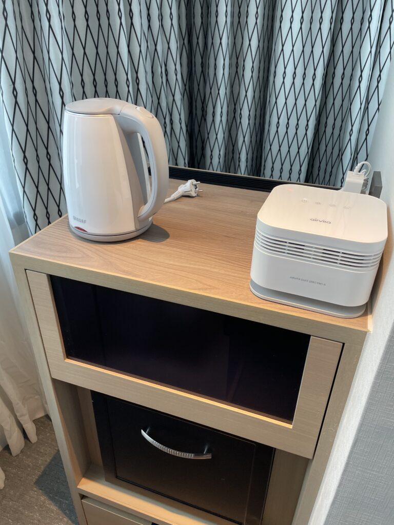 空気清浄機や、電気ポットもあります。引き出しにはマグカップと、緑茶とティーパックコーヒーそれぞれ連泊でも一人1つずつ/泊を頂けました。