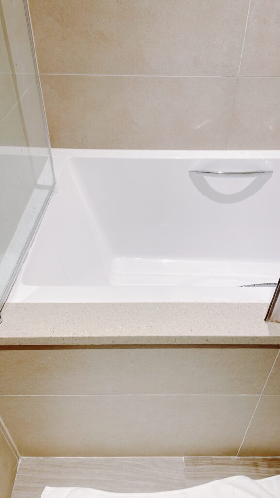 部屋によって浴槽の有り無しがあるそうです。一番安いお部屋だと浴槽が無いかと思われます。気になる水圧ですが、特に問題はないです。