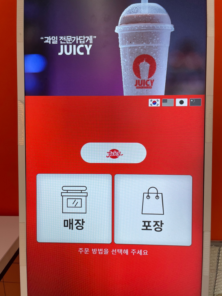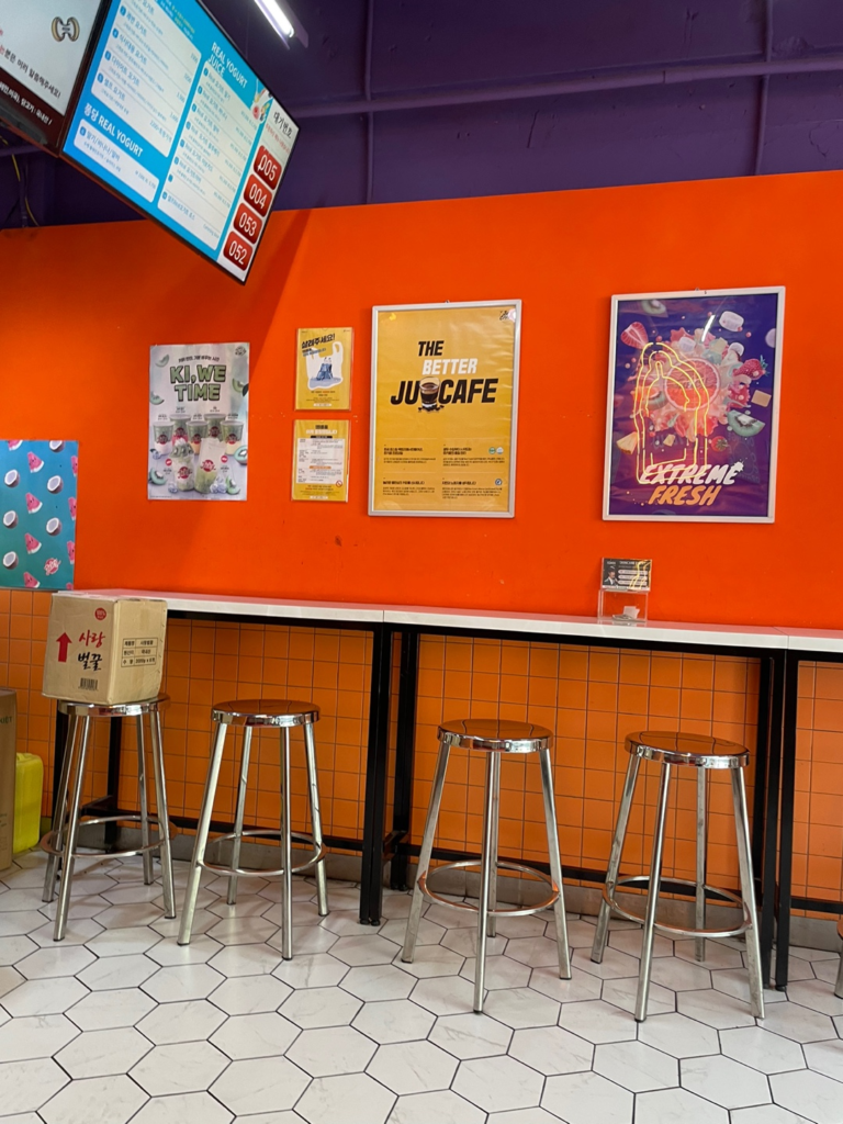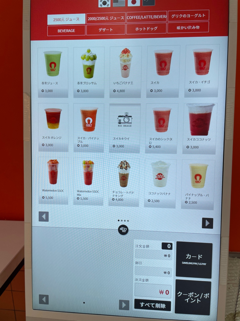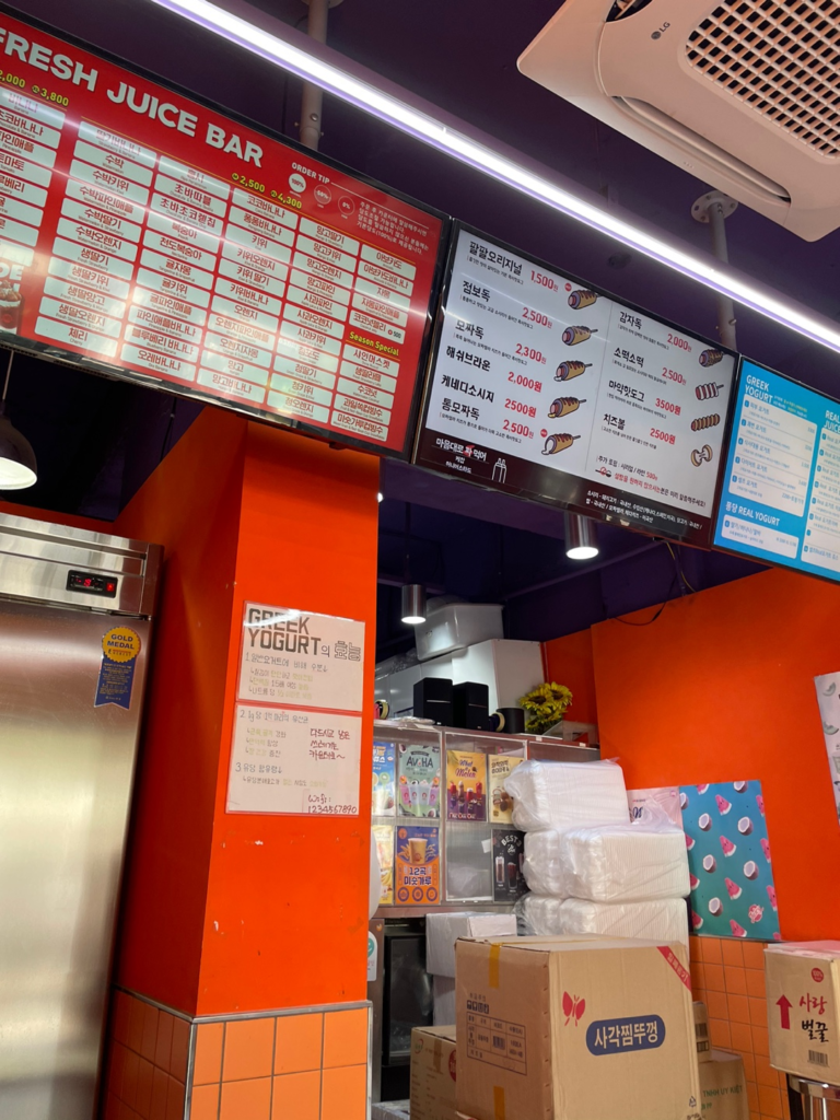 韓国観光ではこのように町中に安くて美味しいジューススタンドやコーヒースタンドが多いのでそれも楽しんでください。
