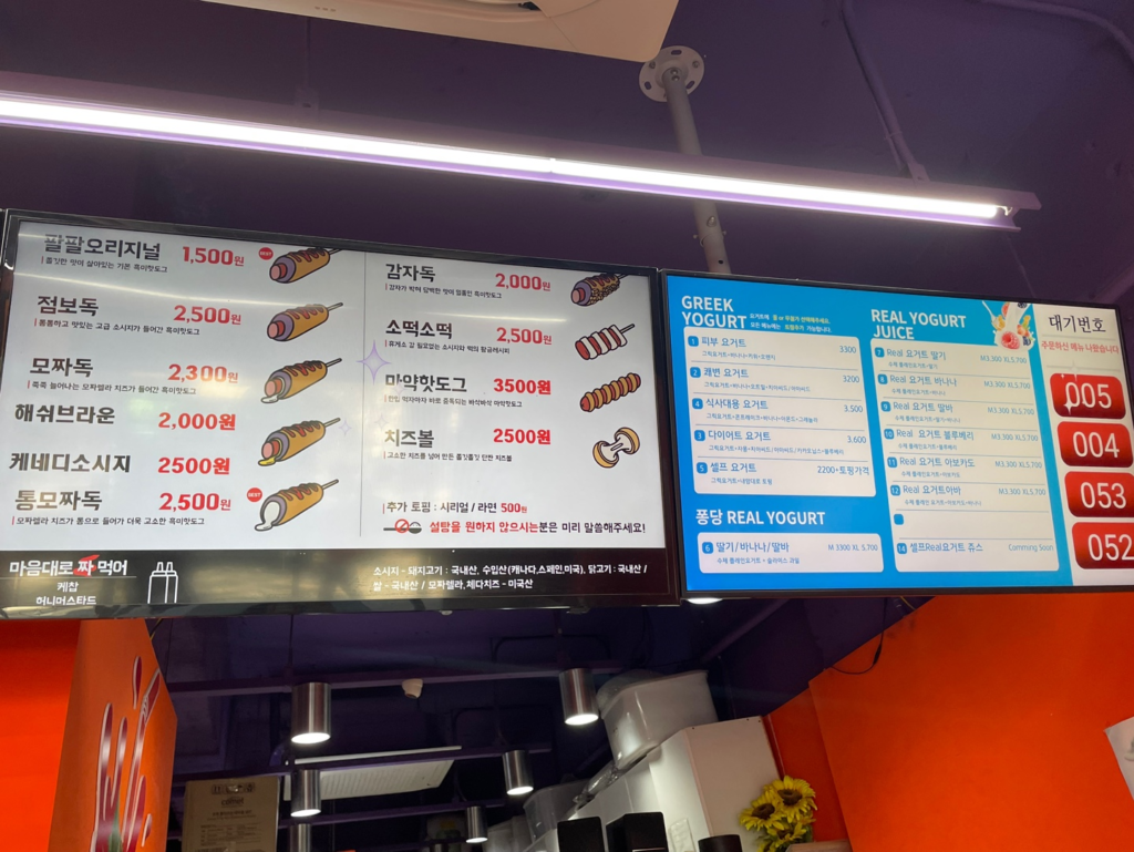 ハットグのオリジナルだと1500ウォン(170円ほど)、ソトクソトクは2500ウォン(280円ほど)です。