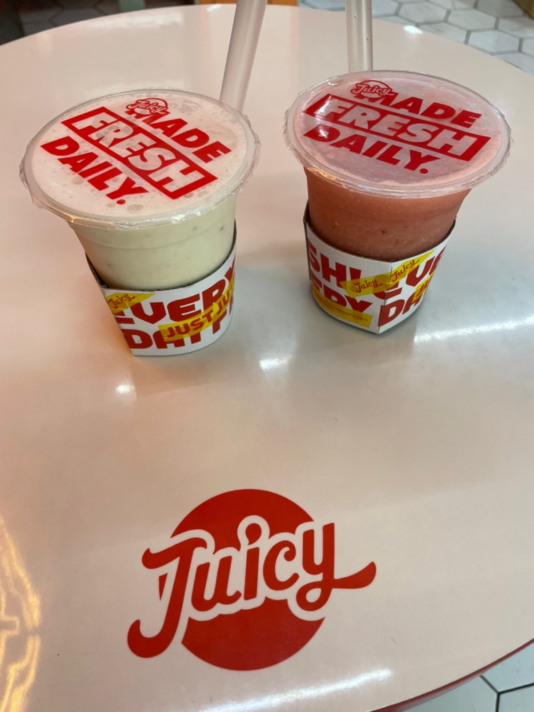 左側は「ココナッツバナナ」にしました。初めて飲んだのですが中にナタデココ?を小さく刻んだものも入っていて夏らしくて美味しかったです。バナナだしナタデココもあるので、わりとお腹にたまりました。