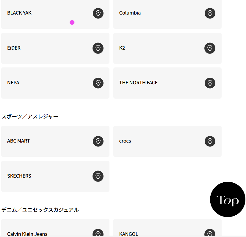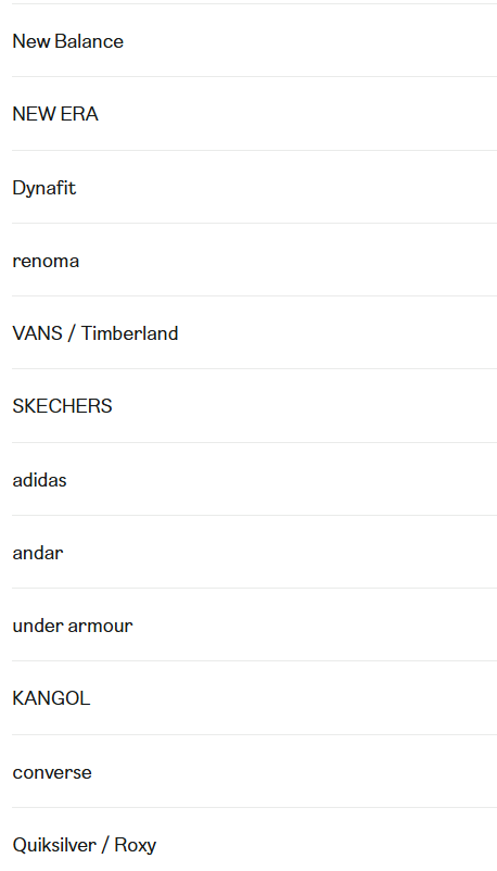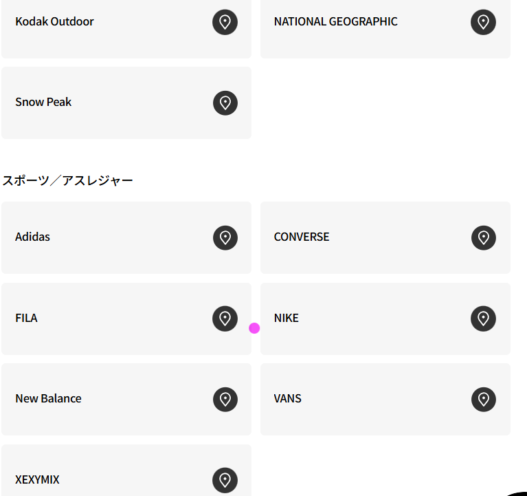 スノーピークやナショナルジオグラフィックもあるので、ここでアウトドア系ペディン(ダウンコート)は買えそう。またアディダスやFILA,NIKE等もペディンを出しています。