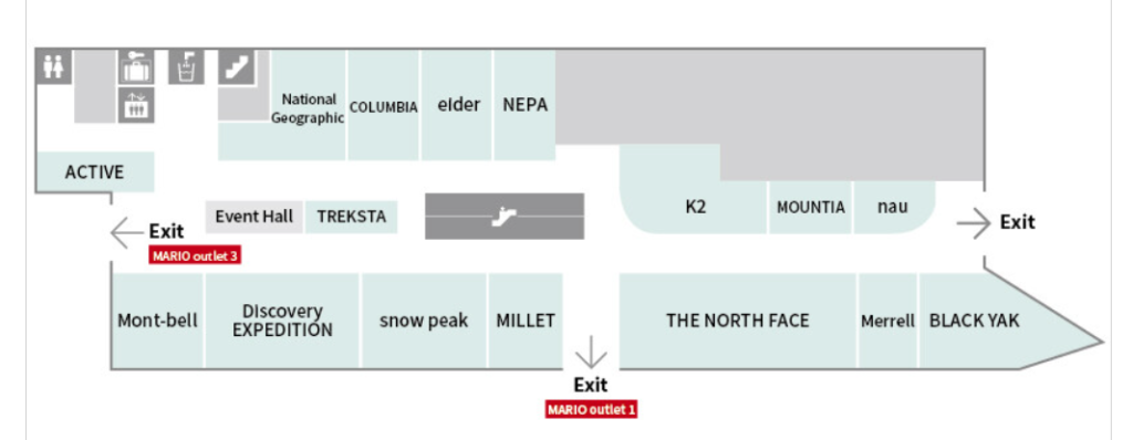 アウトドアブランドが集まり、以下の記事でもご紹介した「ノースフェイス」「ブラックヤーク」「ディスカバリー」「スノーピーク」「モンベル」などがあります。