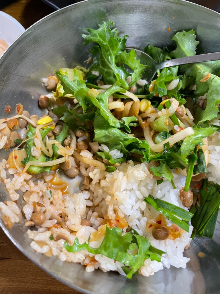 大きめ銀色のボウルに野菜とご飯、チョングッチャンを入れて混ぜてビビンバにするように説明されました。