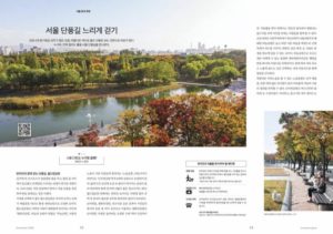 11月号は秋なので、ソウルのお宮を紹介しています。今回は「ソウルの紅葉の道散歩」を テーマに、「自転車 それとも歩き?」 「ペットと一緒に それとも一人?」などの小テーマを設け、綺麗な写真とともに紅葉スポットが紹介されていました。