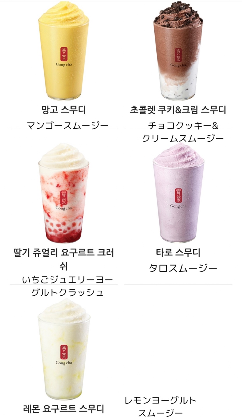 日本にもフローズンティーとして「チョコ」、「マンゴー阿里山」、「抹茶」の3種類はありますが、韓国ゴンチャのスムージー数は圧倒的です。