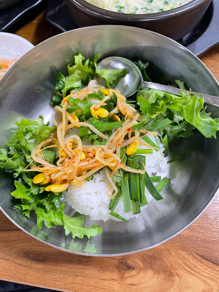 大きめ銀色のボウルに野菜とご飯、チョングッチャンを入れて混ぜてビビンバにするように説明されました。