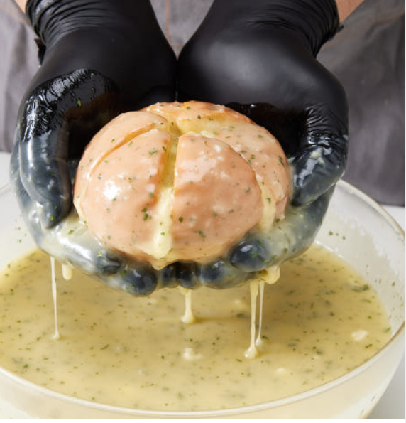 日本では考えられない量のにんにくを、砂糖やバターなどと和えたにんにくペーストがパンにびっちょりとついています。(パンがしっとり湿るくらいの、大量のにんにくペーストでまさにびっちょり)