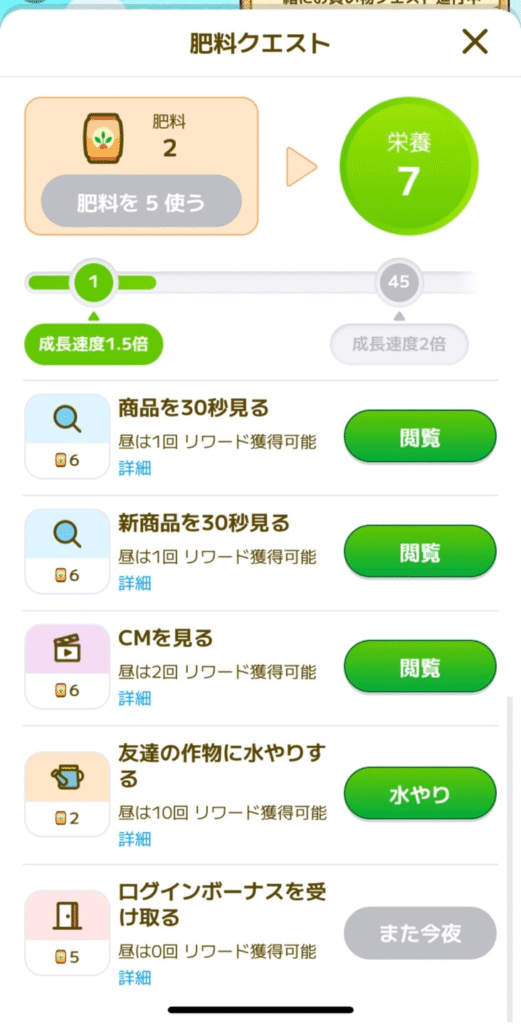 肥料のクエストも水のクエストと似たもの。同じように広告動画を観るなどで肥料がもらえます。