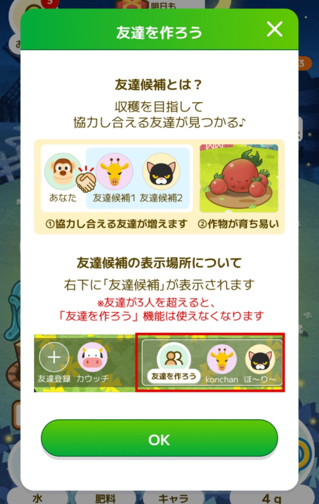 野菜の画面の下部に、友達を作ろうというボタンがあります。