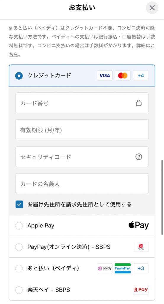 カウシェネットショップで何か買う際の支払いはクレジットカードもできますが、クレジットカードの情報を入れるのが怖いなら、PayPayなどの支払い方法も選べました。