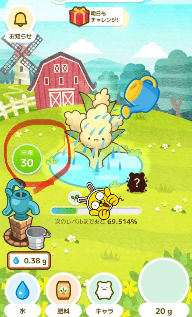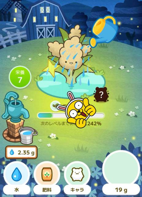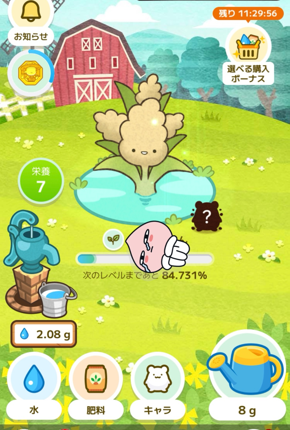水をあげると「次のレベルまであと〇%」が徐々に減っていき、レベルが上がって大きくなり最終レベルの収穫に近づきます。