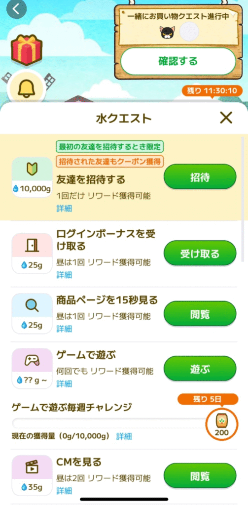 他にもカウシェ内のネットショップで買い物をしたり、特定のアプリをダウンロードしたり、自分の紹介リンクから誰かがカウシェをダウンロードしてくれたら、などで水がもらえるというのもあります。