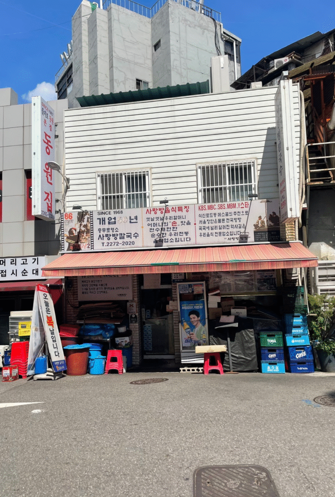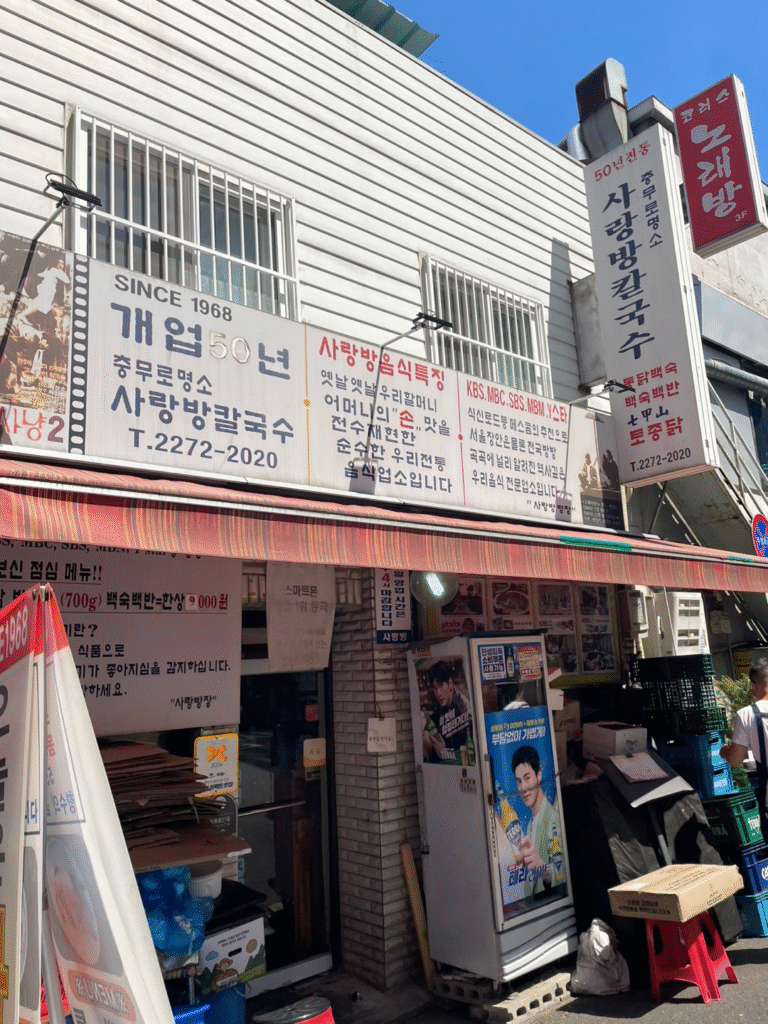 この「사랑방칼국수」と書かれたハングルの白い看板が目印です。