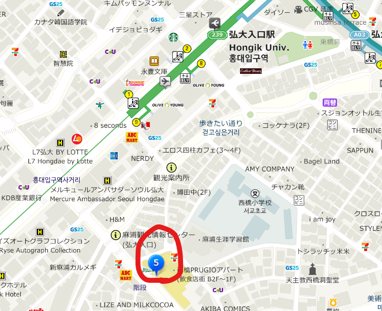 弘大入口駅より徒歩4分。ダイソーがある通り沿いにあり。