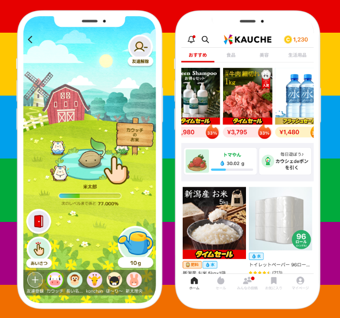 カウシェというお買い物アプリ(ECサイト)内の野菜育成コーナー。画面内で育てた野菜が収穫できると、カウシェで使える100%割引クーポンが貰える=無料で野菜が貰えるという仕組みです。