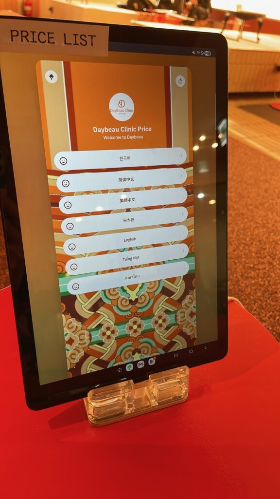 待機場所にはWi-Fiやコンセントもあり、タブレットで各言語で価格表が見られるようになっていました。