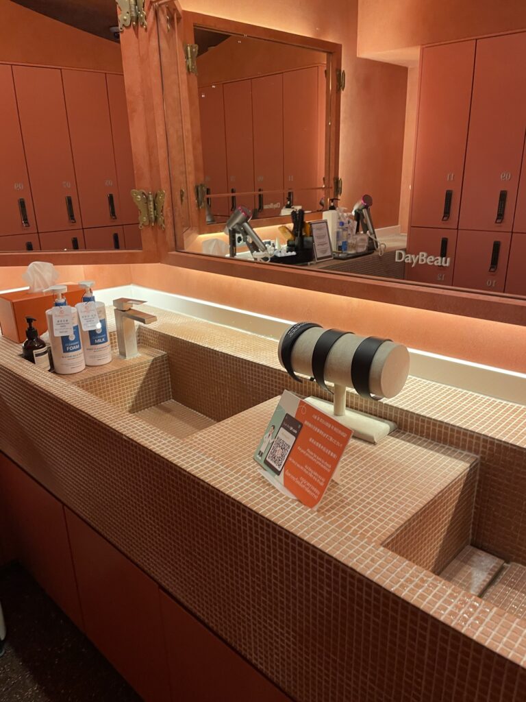 1階に移動して洗顔します。ヘアゴム、ドライヤー、日焼け止め、ティッシュ、タオルなど揃っています。