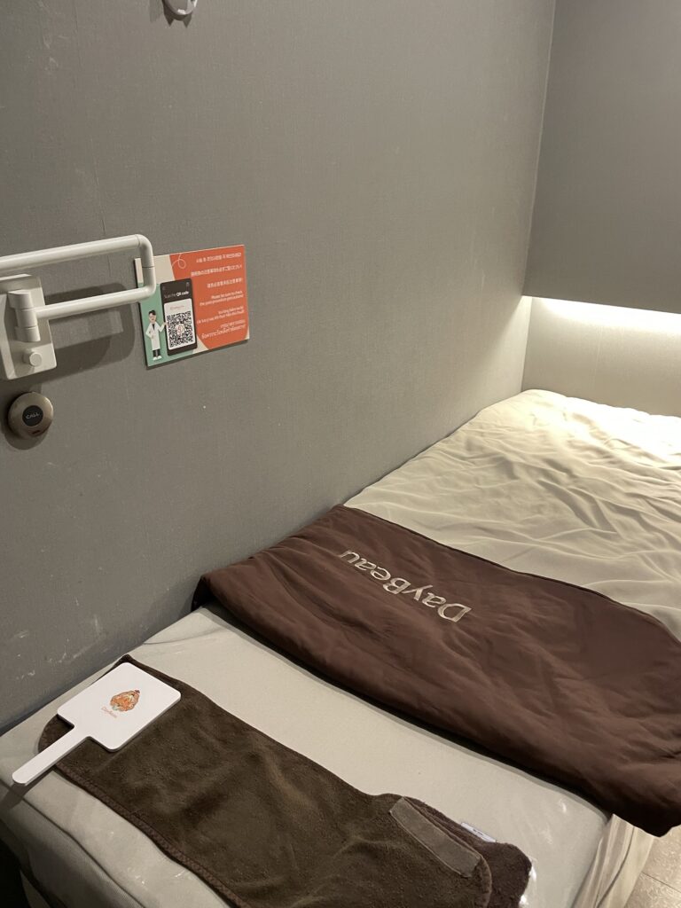 施術室内の中はスタッフさん呼び出しベルも壁に設置、一室ごとに監視カメラもついていて安心。