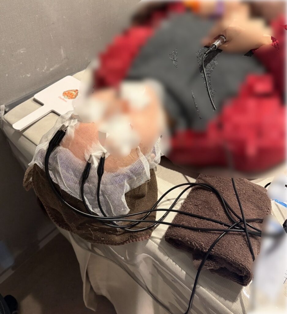 その上で電線を繋ぎ、ビリビリ棒ようなものを手に持って、数十分ベットに寝て待ちます。