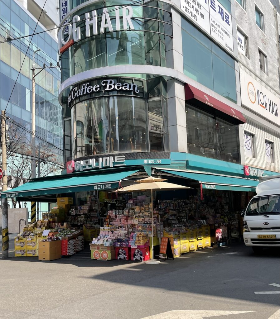 弘大のメイン通りから少し入った場所にあり、このマート前の二手に分かれる道が目印。右側へ。