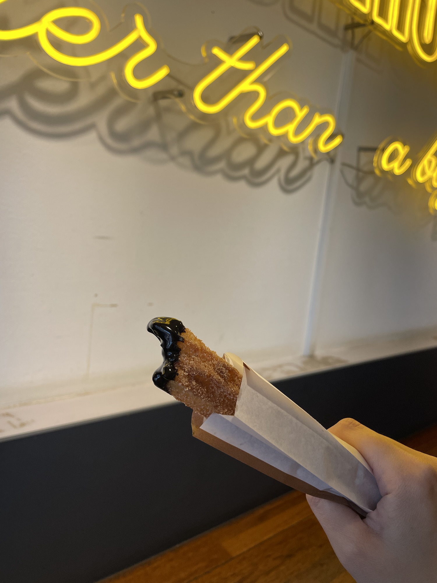 付けるとチュロスのシュガー味が消えてしまい、また1本食べるにはチョコソースが余ってしまいもったいなく感じました。
