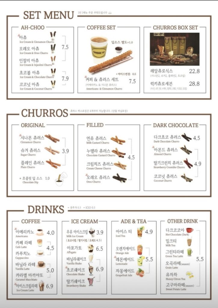 アメリカンコーヒーとチュロスのセットや、チュロスの中にクリームが入っているもの、飲み物もいろいろありました。