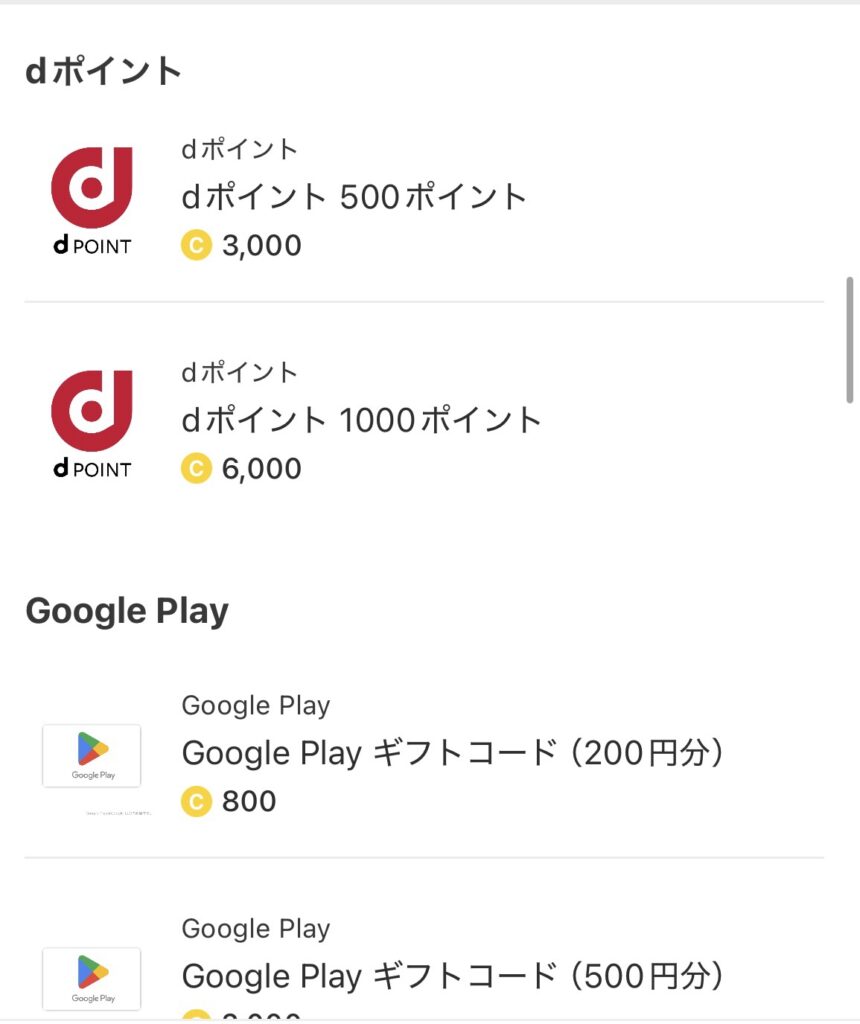 1番少なく引き換えられるのが、Google playの800コイン(200円相当)。