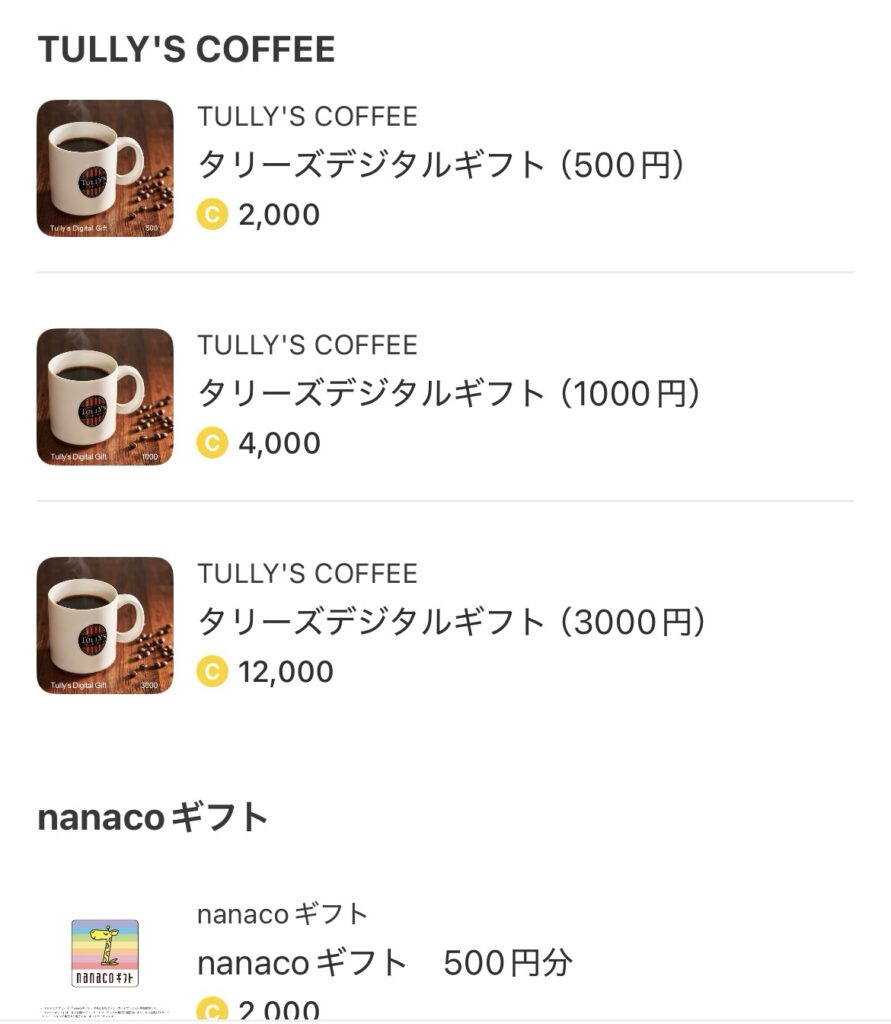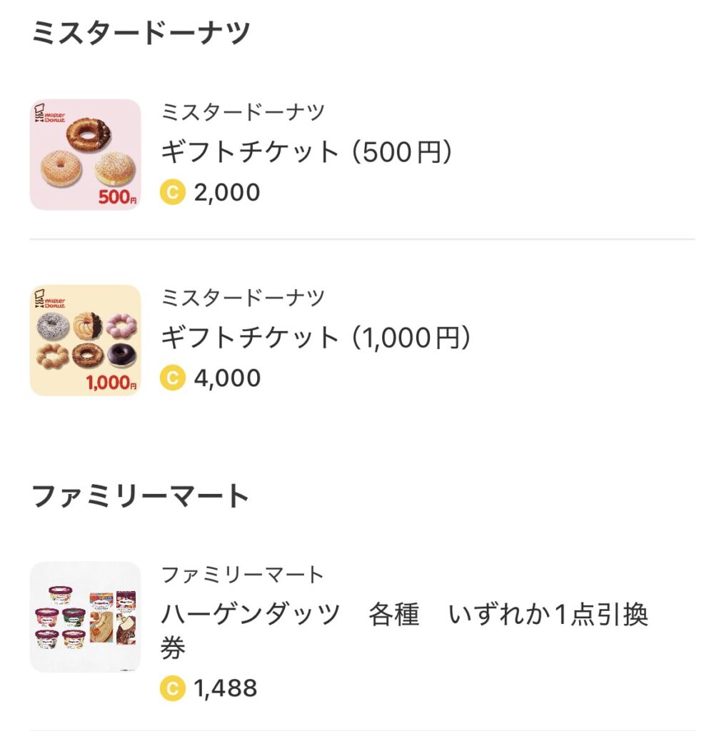 例えばミスタードーナツ、スターバックス、タリーズの商品券、ハーゲンダッツ交換券など。