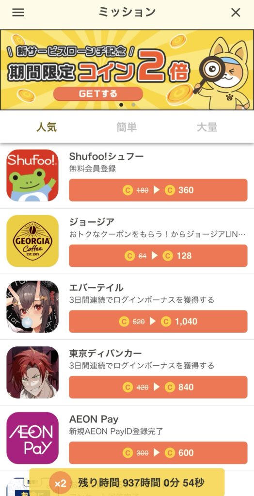 1コインが0.25円。歩数でのコイン回収だけ考えても、1日に1万歩で100コイン(25円相当)をゲットできます。