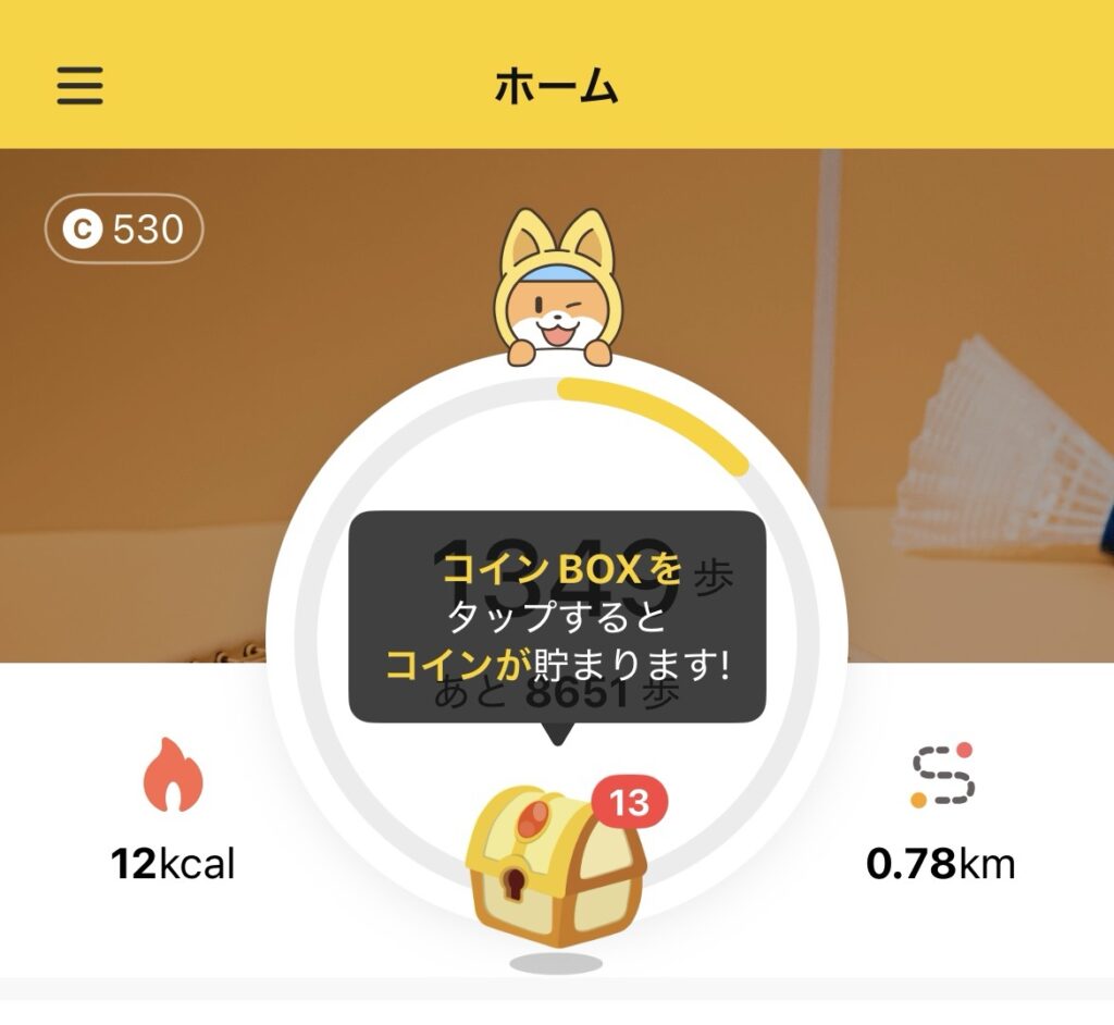 100歩で宝箱上の数字が1つ(1コイン)たまります。最大1日1万歩まで。